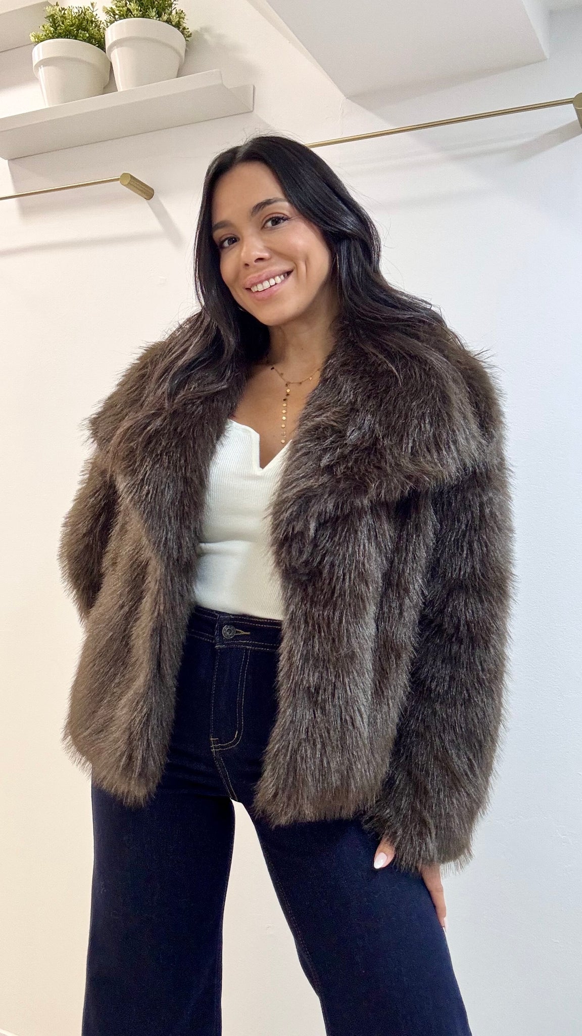 Abrigo en color marrón chocolate de pelo sintético y solapa.